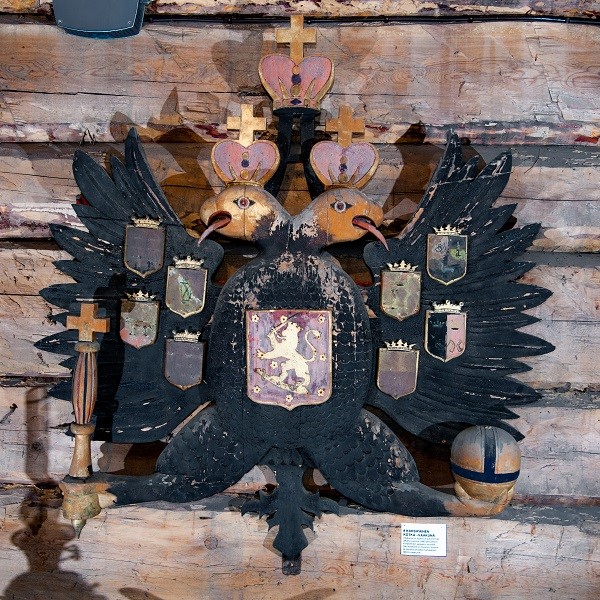 apteekin seinällä. Mitkä kahdeksan läänin vaakunaa ovat näkyvissä?